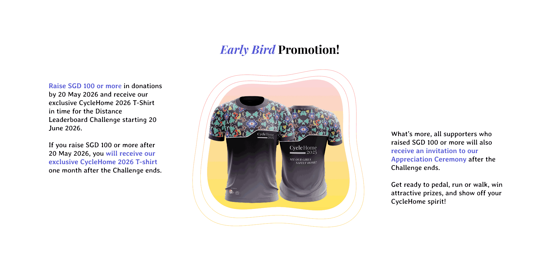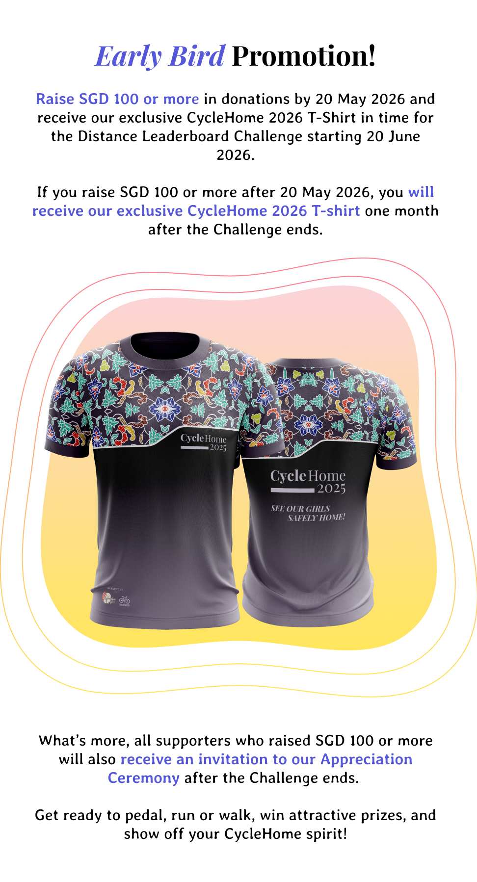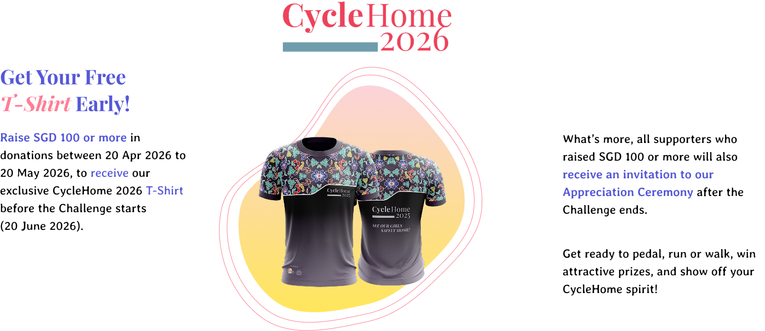 Raise SGD 100 or more in donations between 20 Apr 2026 to 20 May 2026, to receive our exclusive CycleHome 2026 T-Shirt before the Challenge starts (20 June 2026).