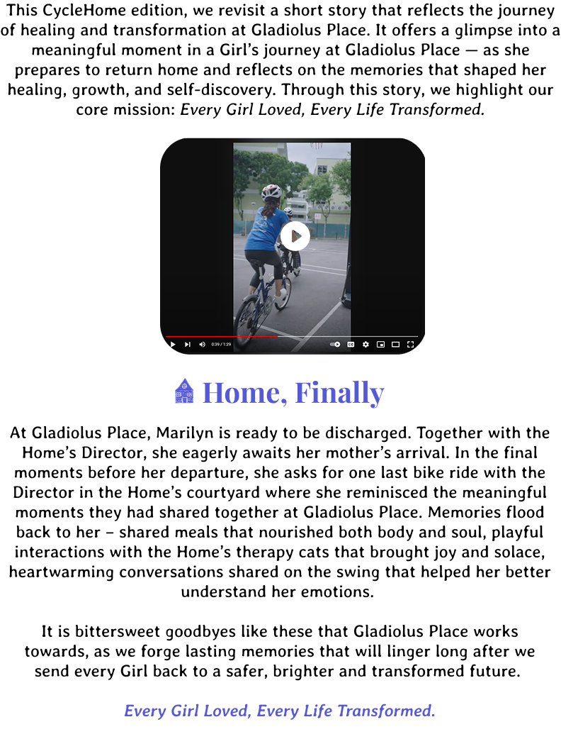 This CycleHome edition, we revisit a short story that reflects the journey of healing and transformation at Gladiolus Place. It offers a glimpse into a meaningful moment in a Girl’s journey at Gladiolus Place — as she prepares to return home and reflects on the memories that shaped her healing, growth, and self-discovery. Through this story, we highlight our core mission: Every Girl Loved, Every Life Transformed.